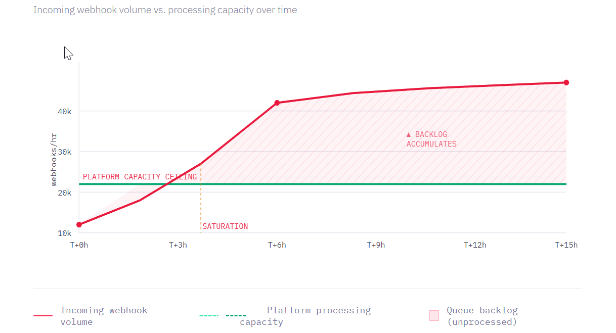 API integration load is no longer predictable. A single enterprise customer onboarding can spike your webhook queue by 10x. A new AI feature can triple your API tool-call volume.