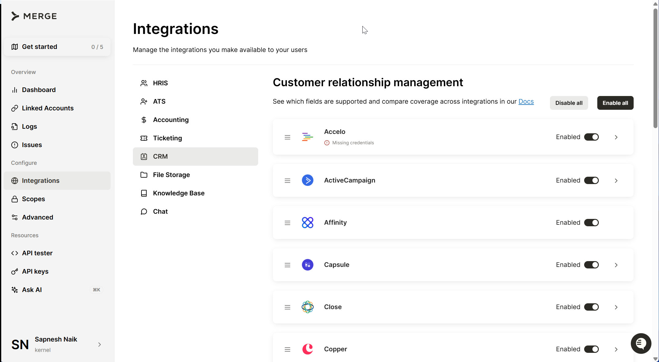 - Pre-built common model for CRM: Merge provides a CRM unified API with normalized objects for contacts, accounts, deals, leads, and more. If your integration needs align with their common model, setup is fast.