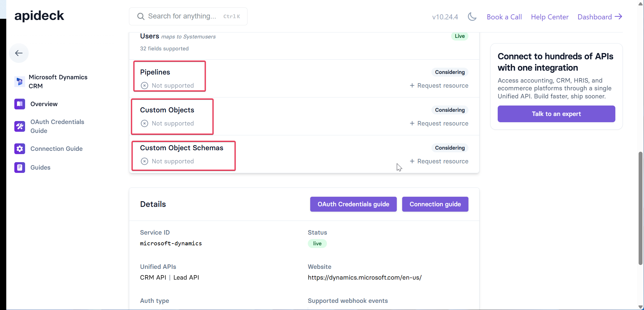 - Narrow depth per connector: The number of supported endpoints and fields per connector is limited. Not all unified data models are implemented across all APIs in a category.