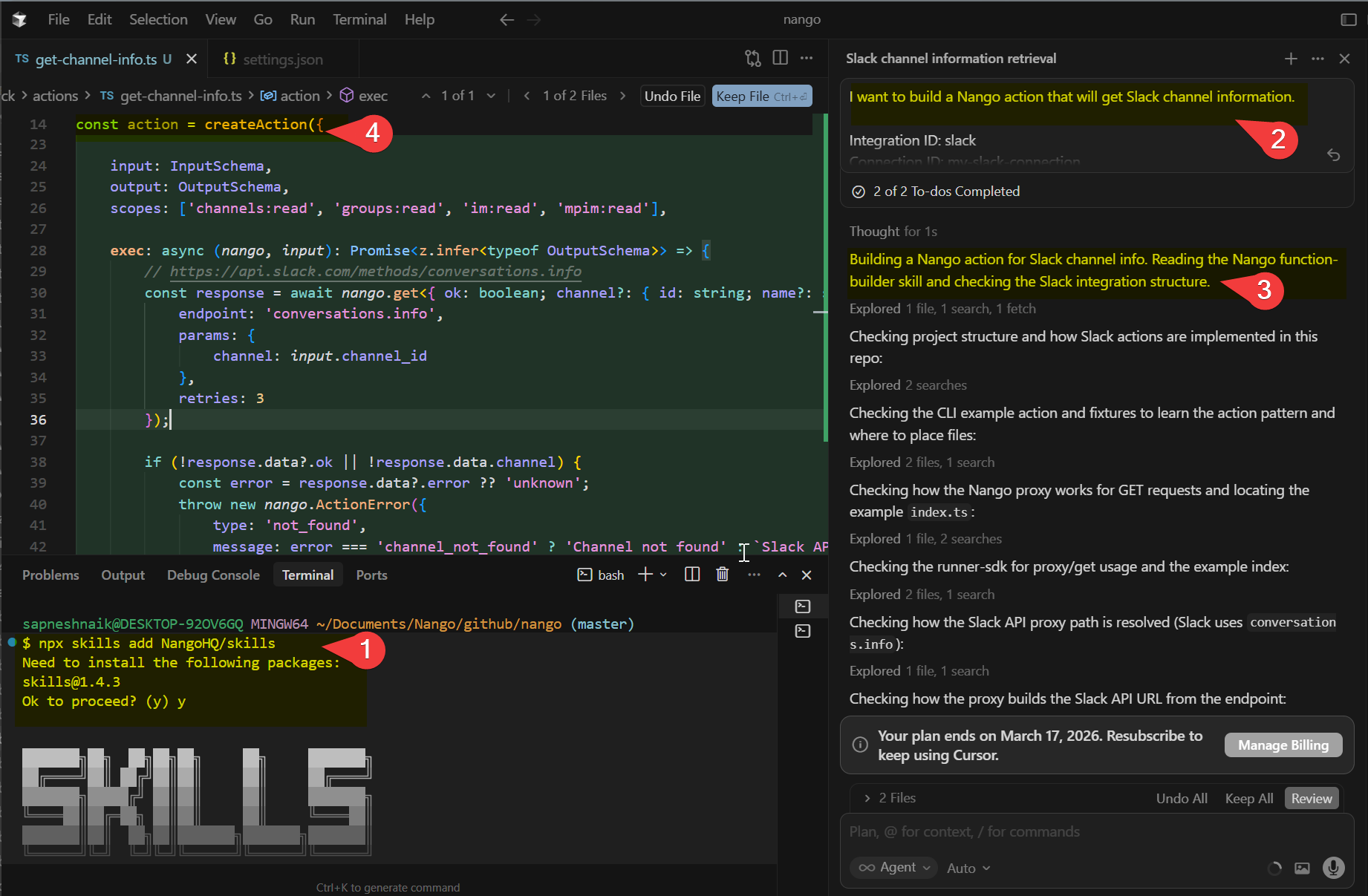 - Custom tool calls with AI coding agents: Nango is code-first, meaning you define tool calls as typed functions. You can use the Nango AI Integration Builder with Claude, Cursor, or any coding agent to build custom tool calls directly on the platform.