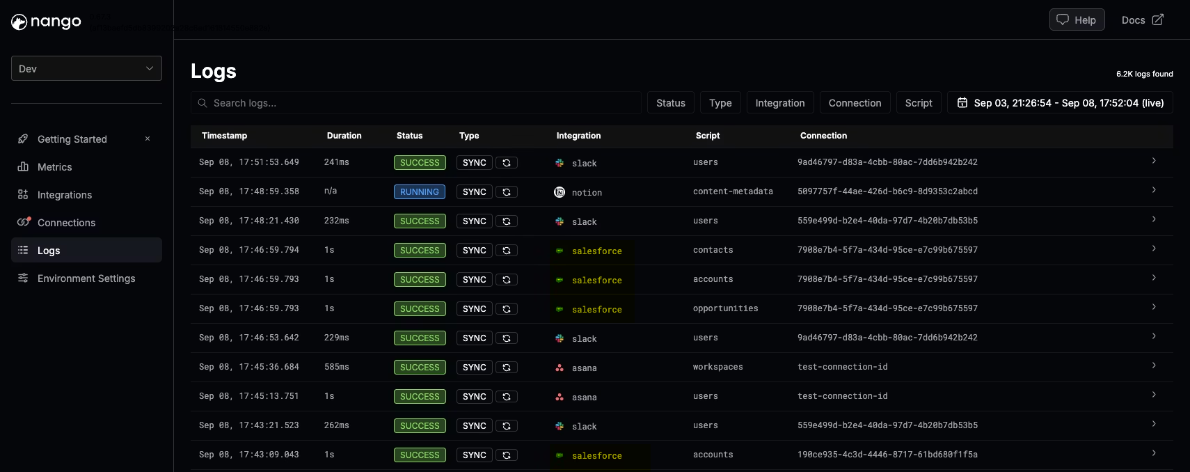 - Logging and observability: Every external API request produces detailed logs. Export traces to any OpenTelemetry receiver. And add custom log messages from your integration code.
