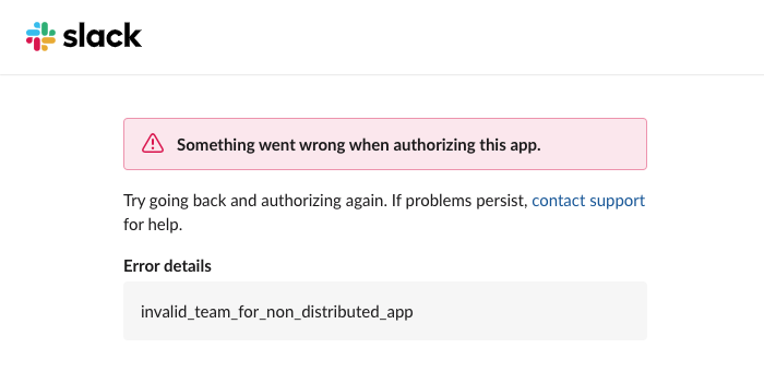 Diagnose and fix Slack's invalid_team_for_non_distributed_app OAuth error when installing apps across workspaces.