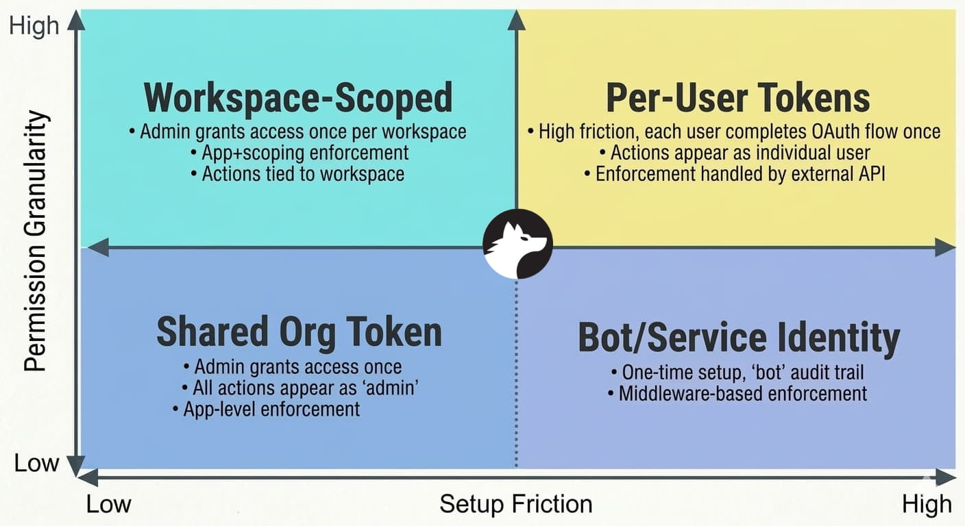 The choice also depends on what the external API supports. Some APIs offer bot tokens (Slack, Teams). Others may only support per-user OAuth or JWT.