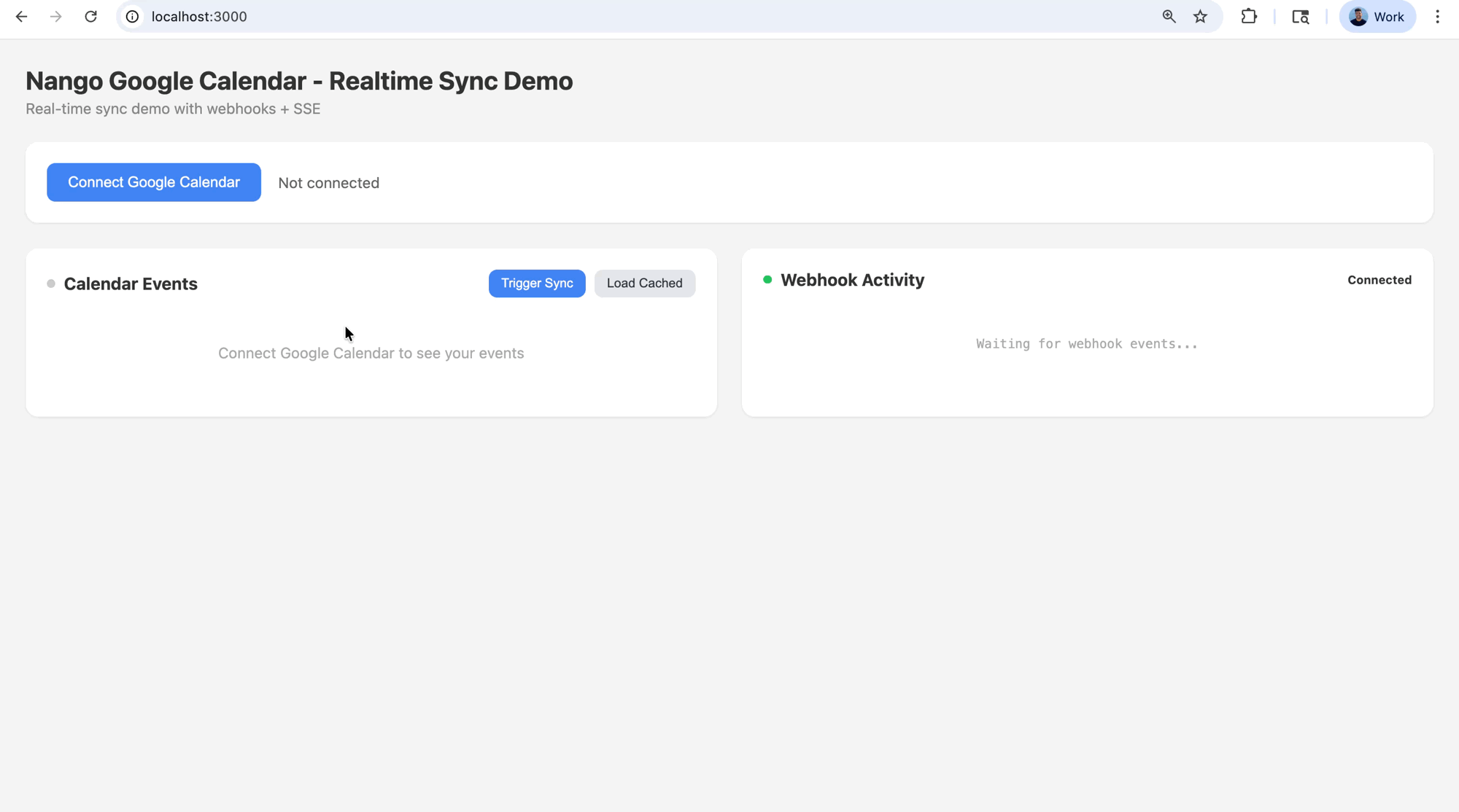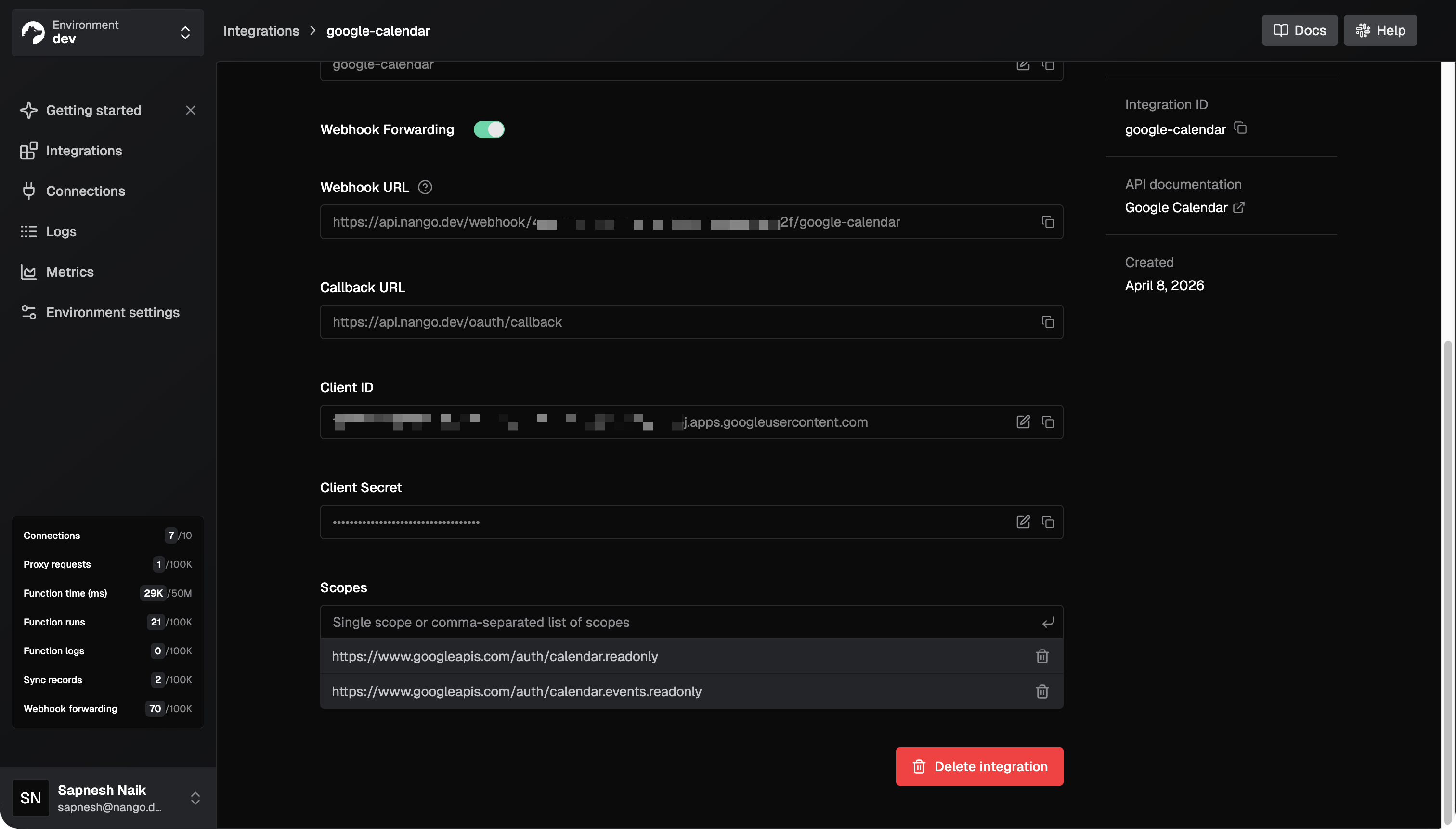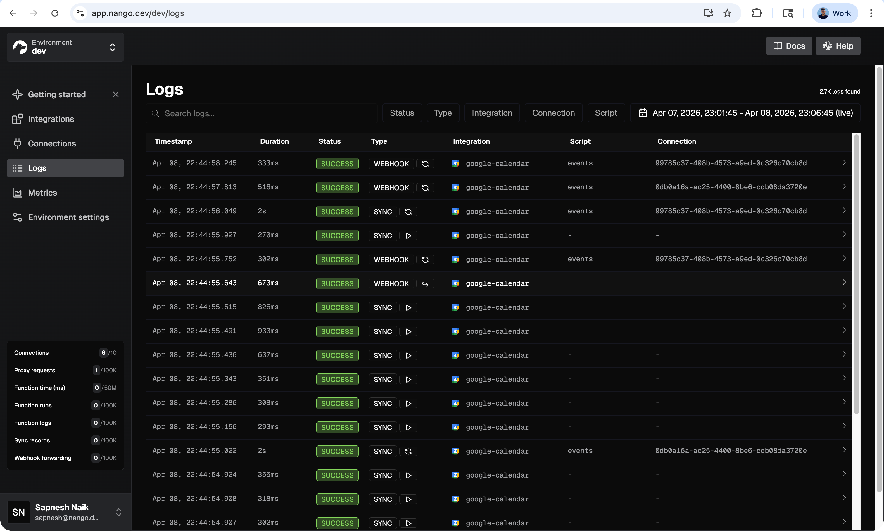 onWebhookhandler triggers an incremental sync, and you should see a sync completion webhook arrive in your backend with the updated record count. - Inspect synced records via Nango’s API or dashboard to confirm the event data matches what you see in Google Calendar.