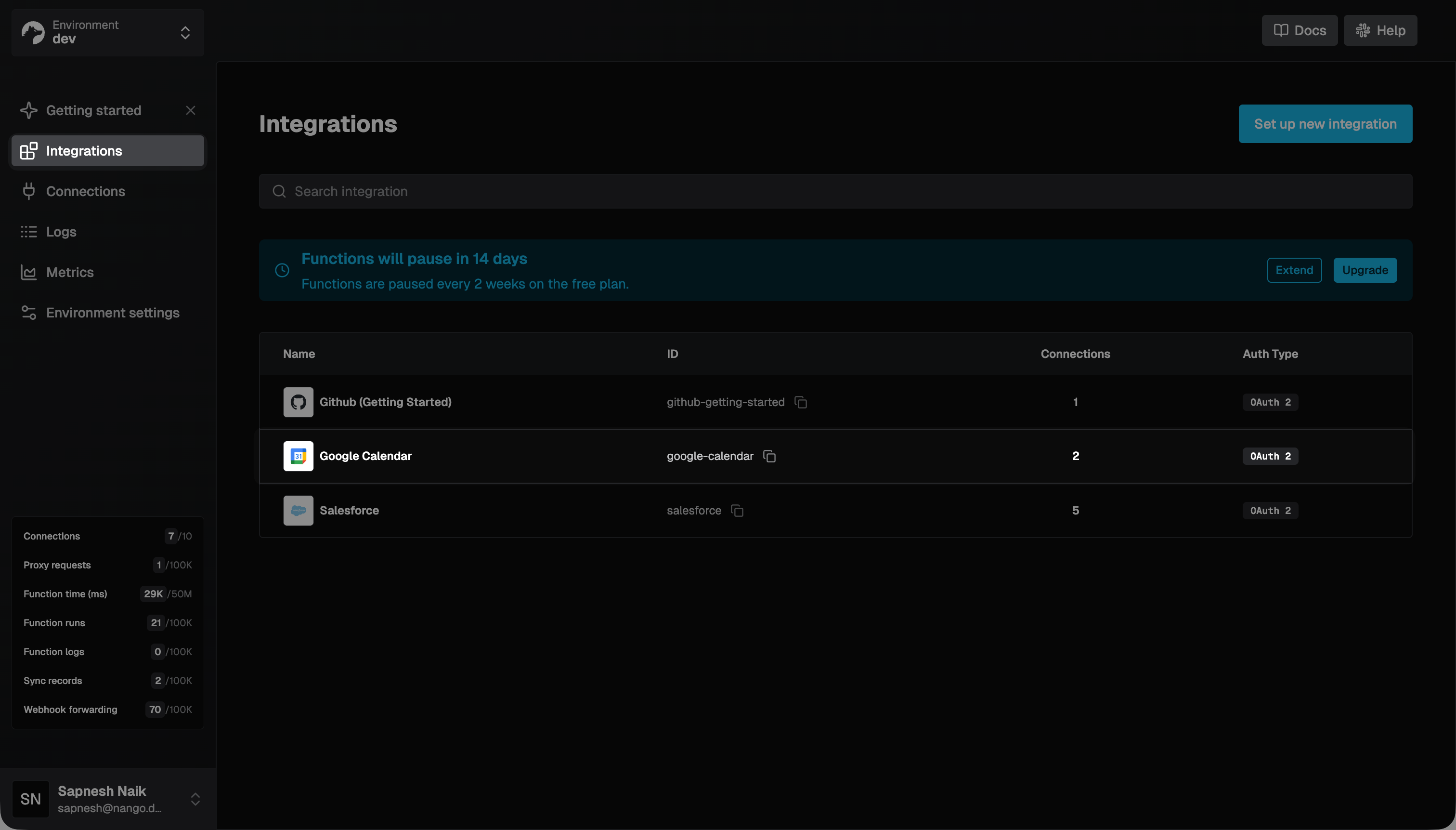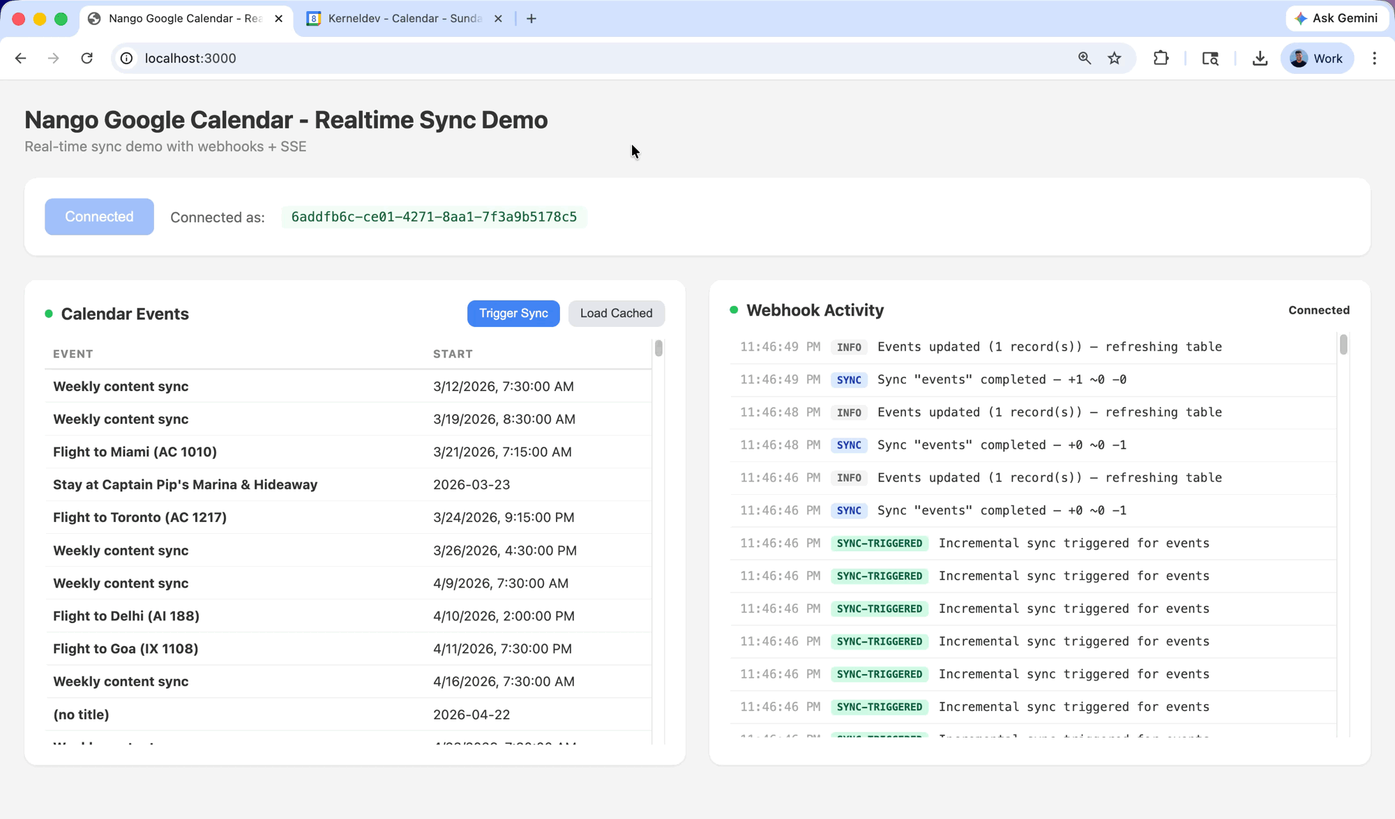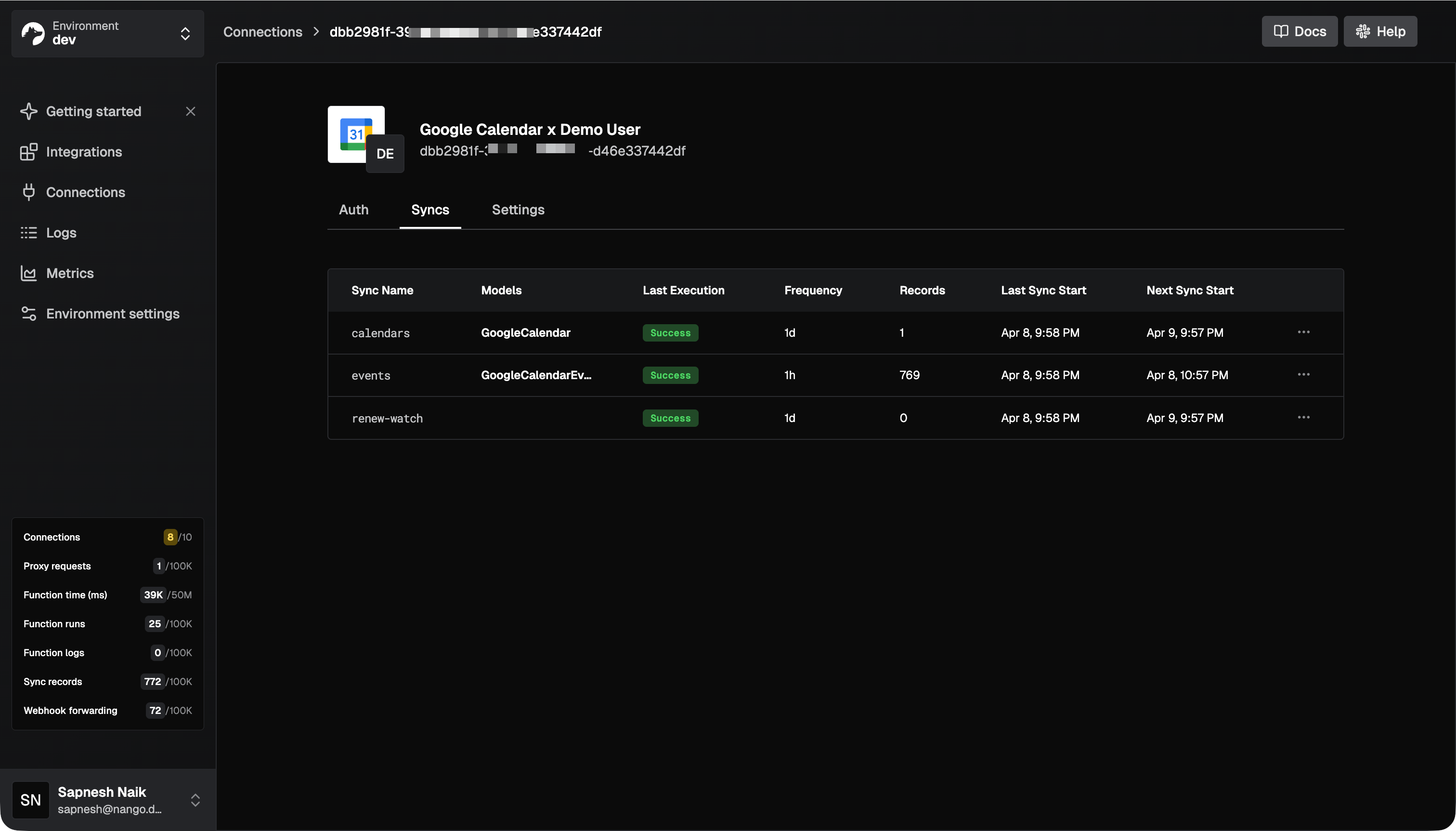 With everything deployed, connect a Google Calendar account through Nango’s auth UI. The post-connection-creation function fires automatically, registering a watch channel. The hourly events sync starts automatically (autoStart: true), and the daily renew-watch sync keeps the notification channel alive.
