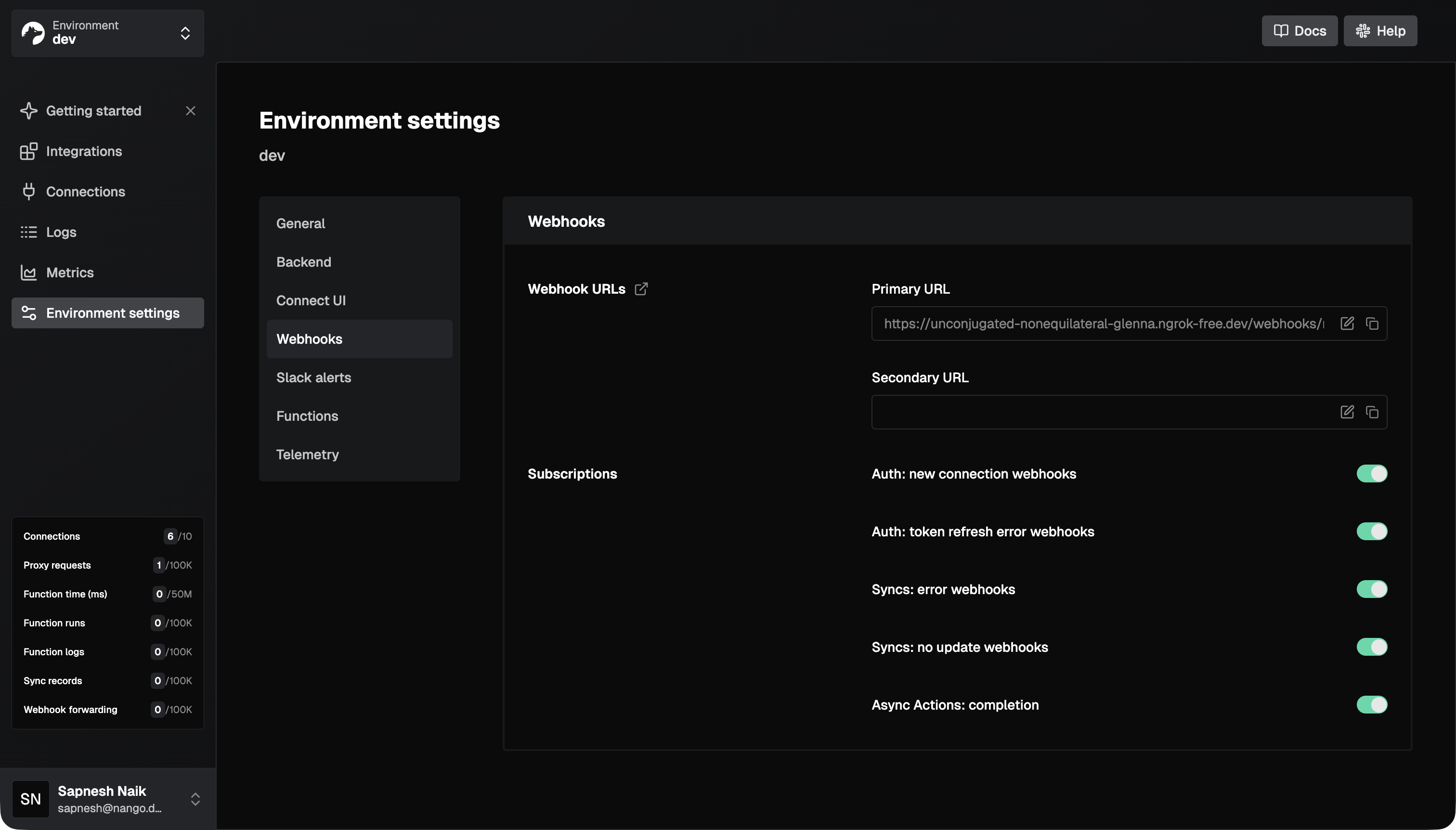 Local testing tip: If you want to test webhooks locally, use ngrok to expose your local server and set the ngrok URL as the webhook endpoint in Nango Dashboard > Environment Settings > Webhook URL.