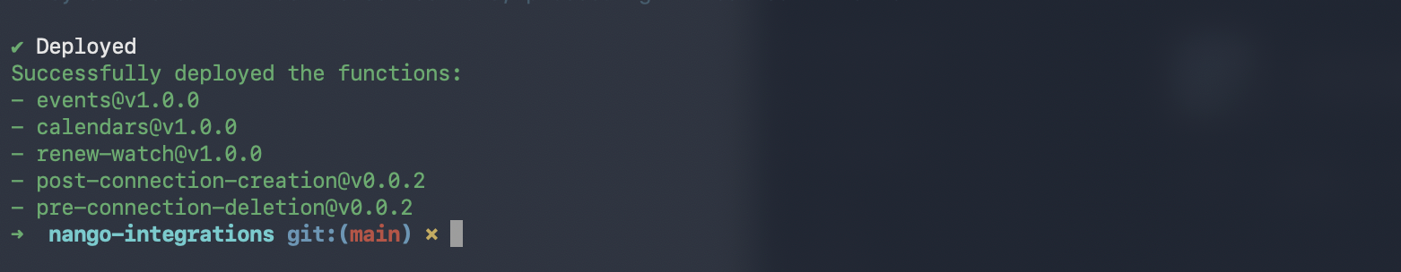 Note: On-event functions (post-connection-creation, pre-connection-deletion) only fire for connections created after deployment. If you already have a test connection, delete it in the Nango dashboard and reconnect after deploying.