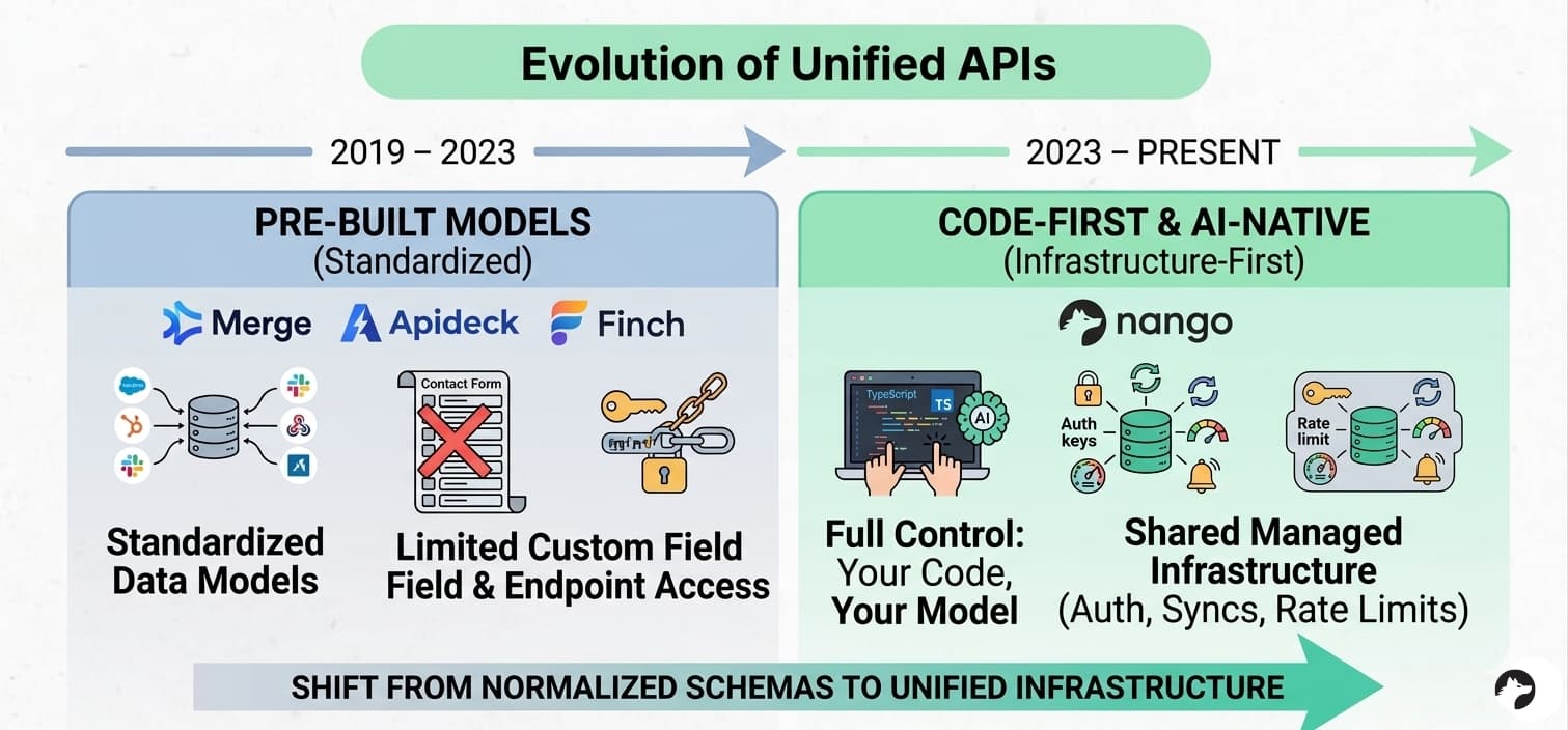 With code-first platforms like Nango, you can still build your own version of pre-built unified data models if you want to. The infrastructure handles the hard parts (auth, rate limits, syncing, retries), and you control the data model layer. This gives you the best of both worlds: the speed of shared infrastructure with the flexibility to normalize data on your own terms. See the best practices for building a unified API for a practical guide on this approach.