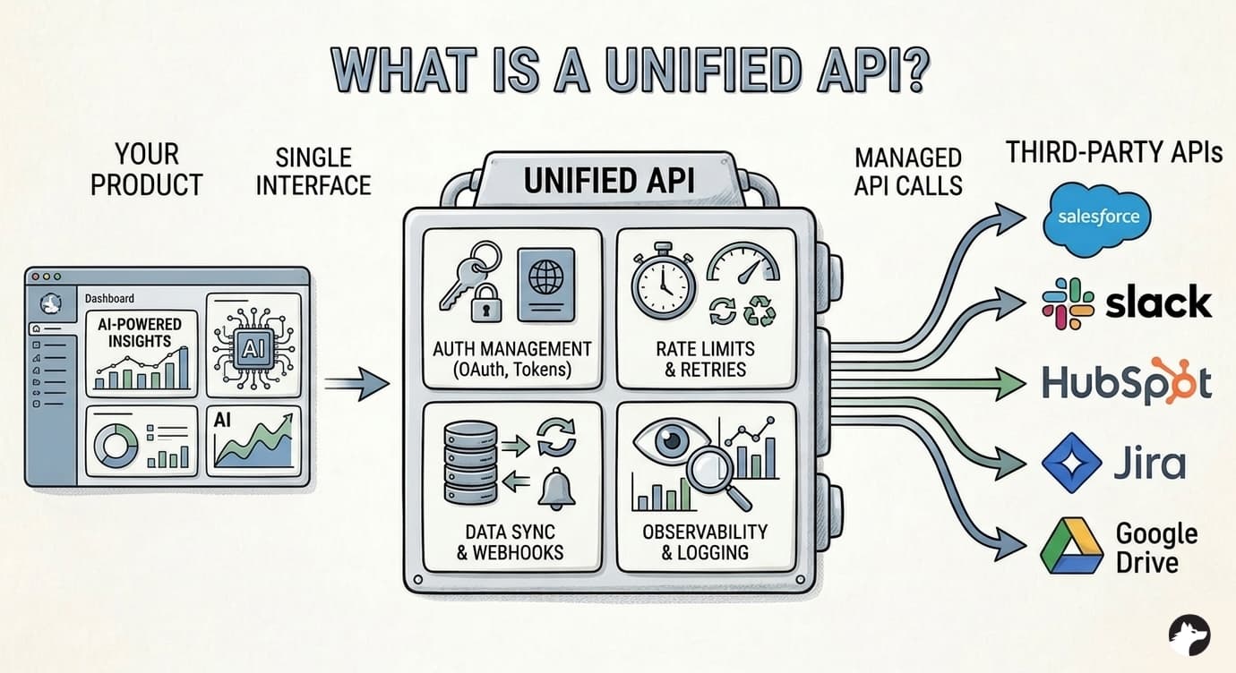 A unified API provides a single interface to build integrations with many third-party APIs. For example, instead of building separate integrations for Salesforce, HubSpot, and Pipedrive from scratch, a unified API handles the heavy lifting (auth, data syncs, webhooks, API calls, tool-calls, rate limits, and retries) so you can ship integrations faster with less maintenance.