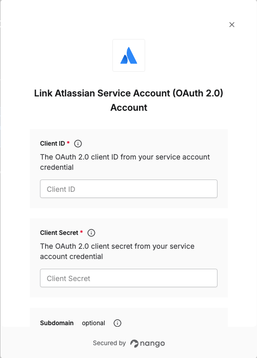 Subdomain during connection creation (recommended) to ensure you connect to a specific Atlassian site, or let Nango auto-select the first available site if no Subdomain is specified. Adding the subdomain ensures you connect to the intended site.Step 3: Enter credentials in the Connect UI
