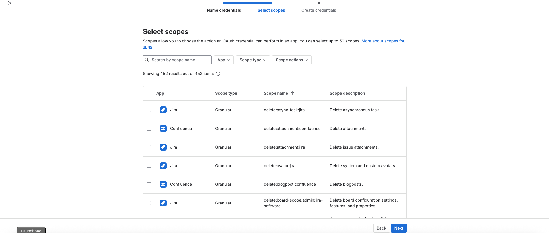 - Select scopes to determine what the API access token can do in Atlassian. Select Next.