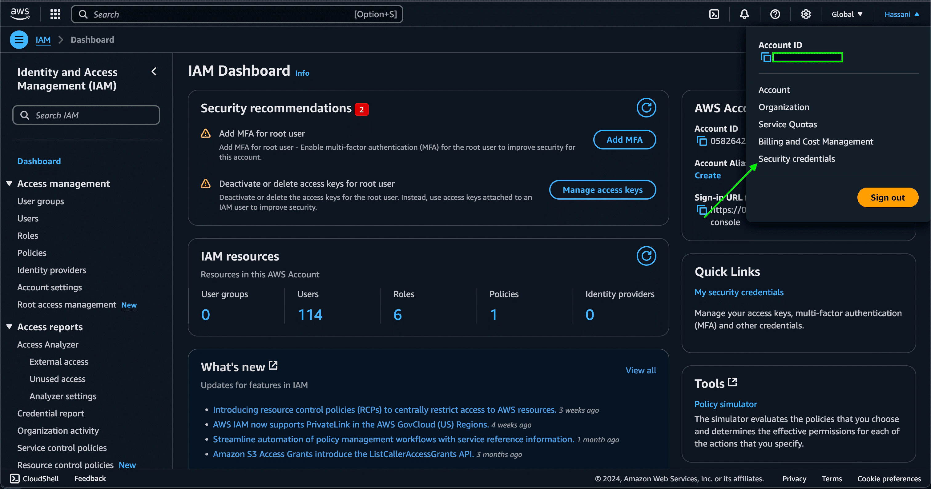- In the navigation bar on the upper right, select your user name, and then select Security credentials.