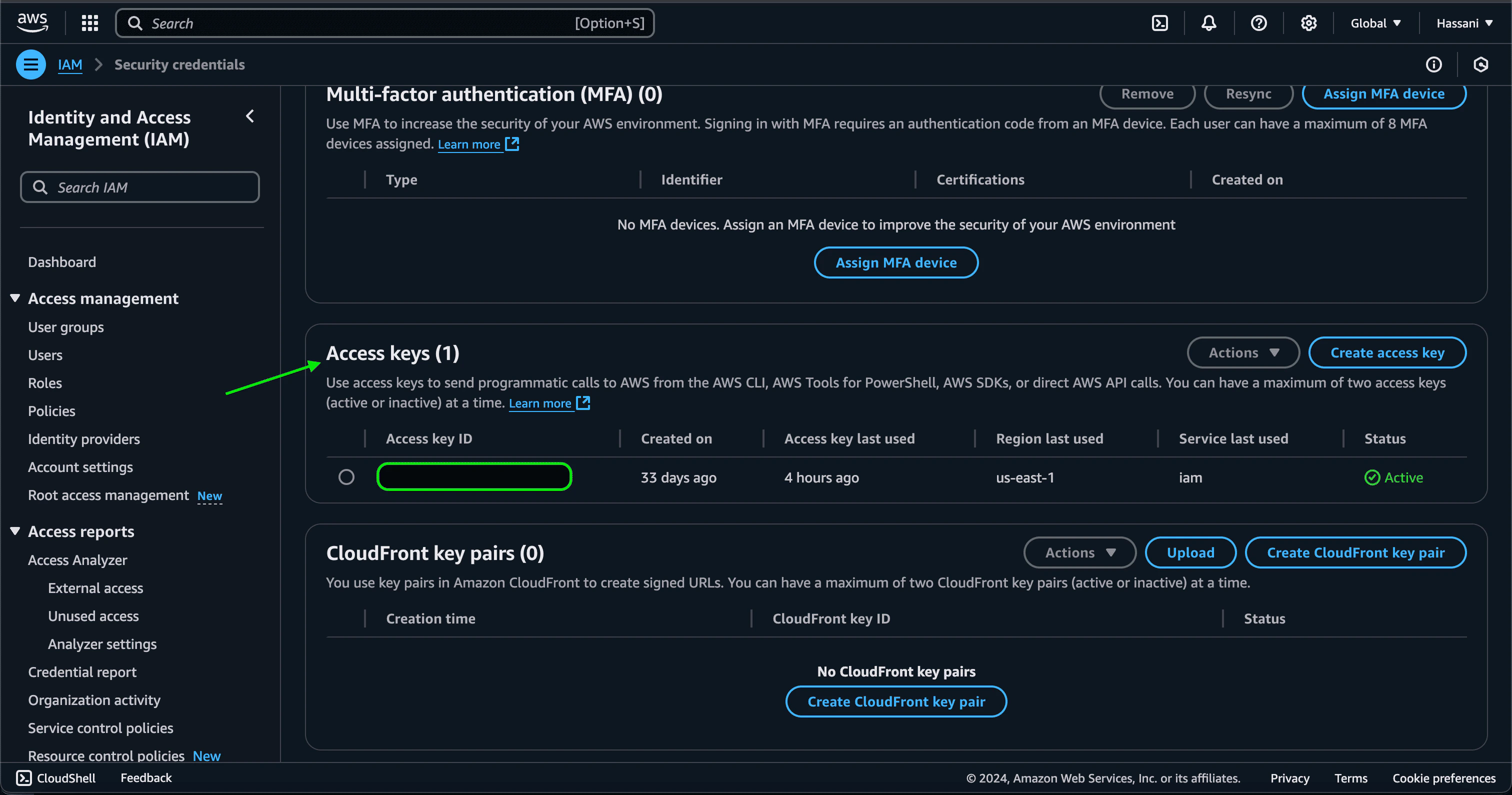 - In the Access keys section, click Create access key. If you already have two access keys, this button is deactivated and you must delete an access key before you can create a new one.