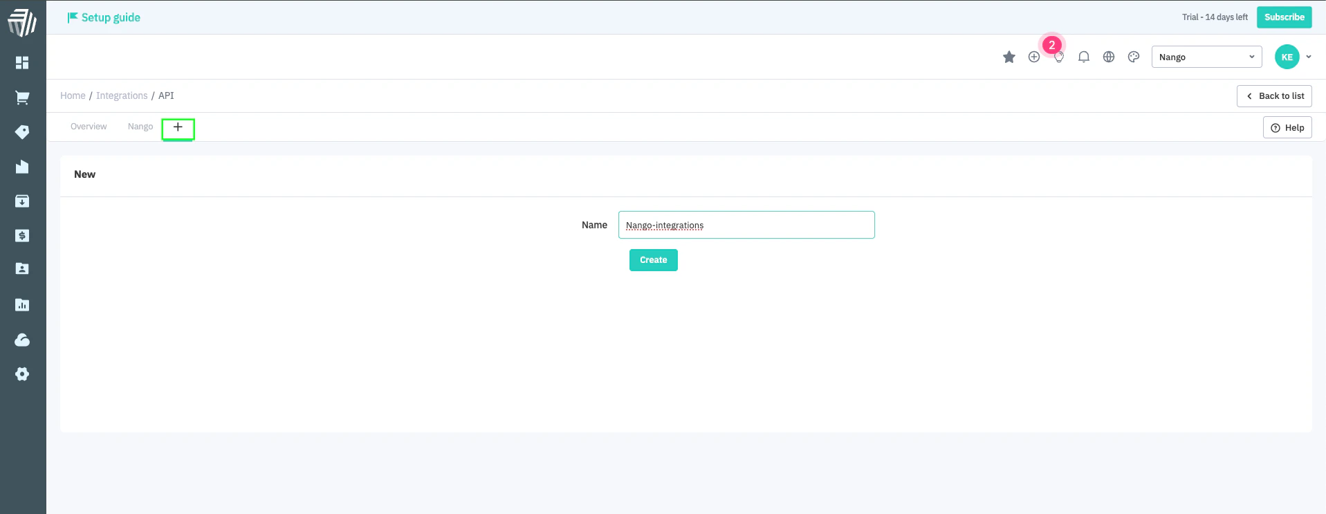 - On the API Integration page, click the + icon on the top right, enter a name for the API, and click the Create button to generate an API channel.