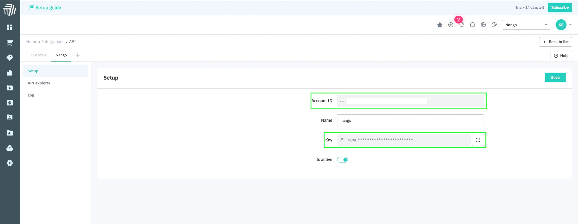 - Cin7 Core will generate an Account ID and Key under the Setup tab of the API Integration page.