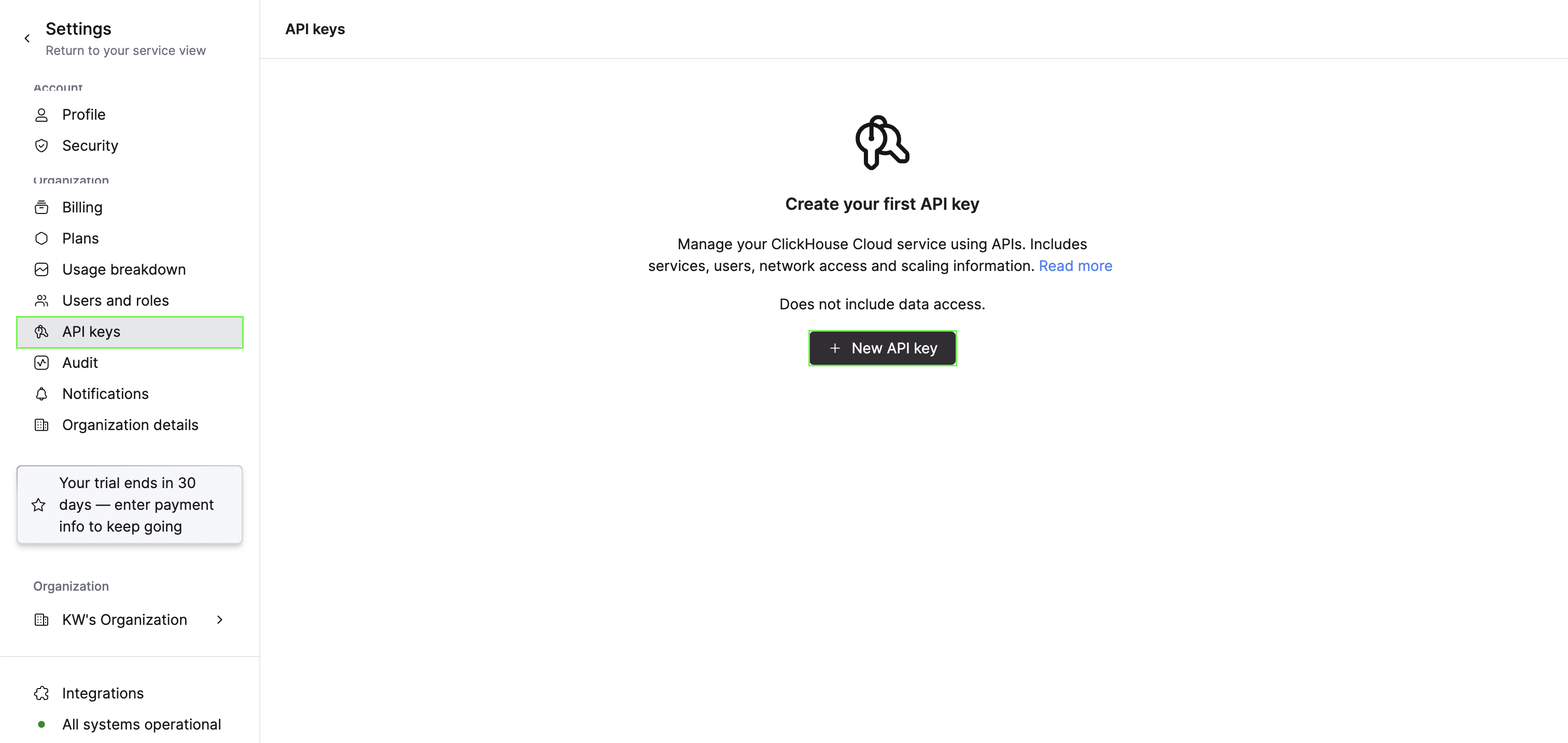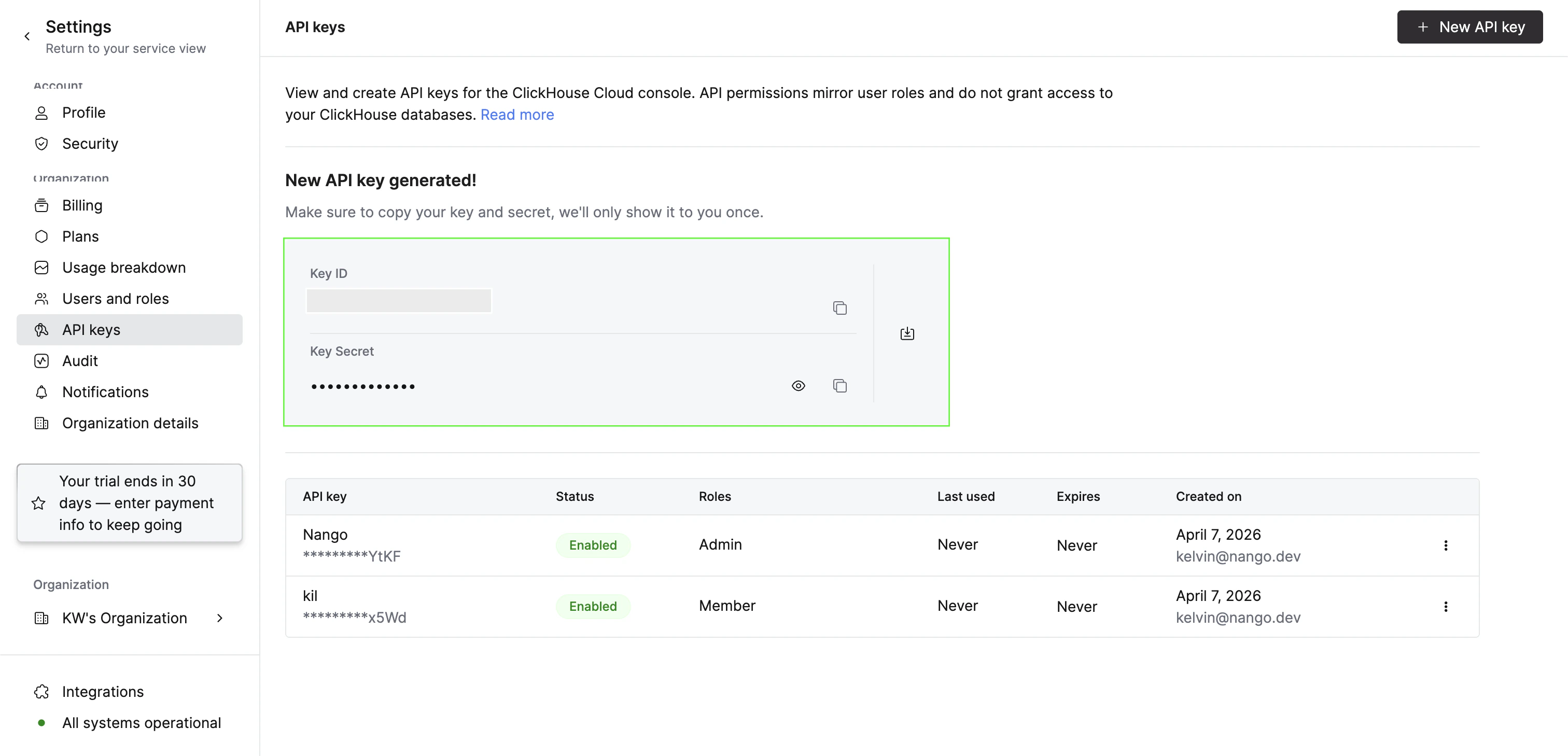 - Key Secret – Your ClickHouse Cloud API Key Secret; used as the Basic Auth password. Keep it secure.