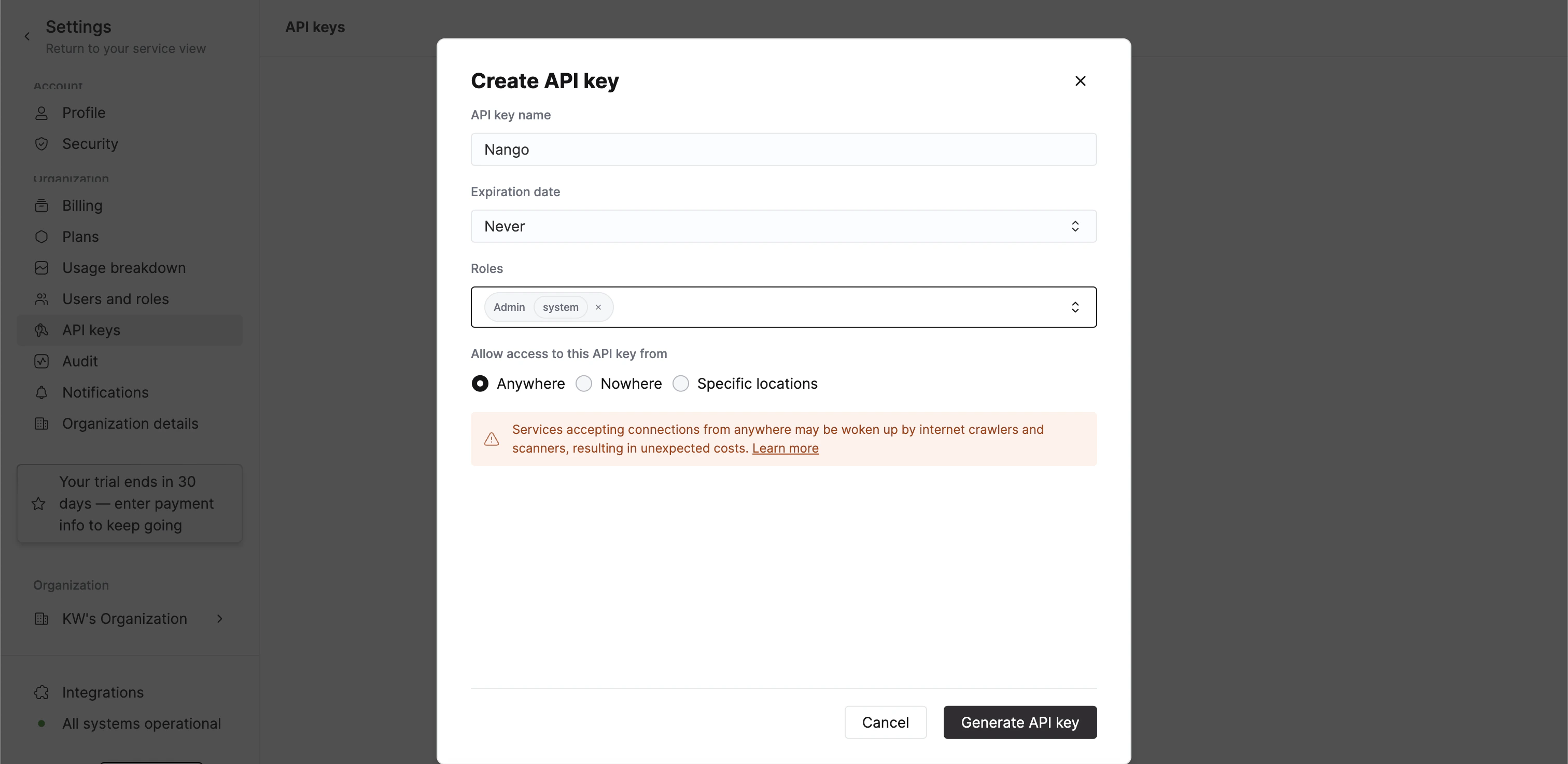 To authenticate with ClickHouse Cloud, you will need:- Key ID – Your ClickHouse Cloud API Key ID; used as the Basic Auth username.