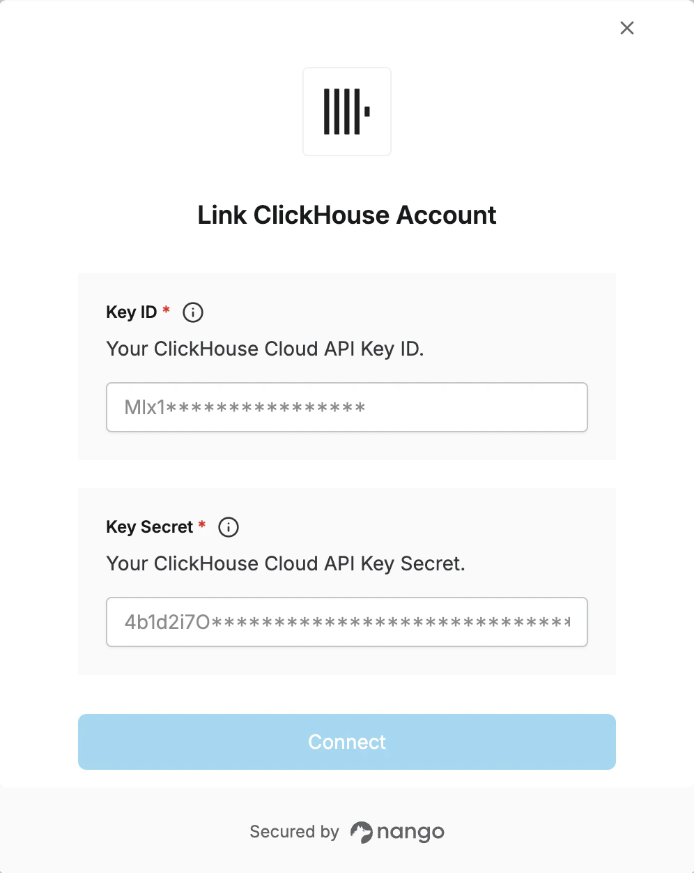 Once you have your Key ID and Key Secret:- Open the form where you need to authenticate with ClickHouse.