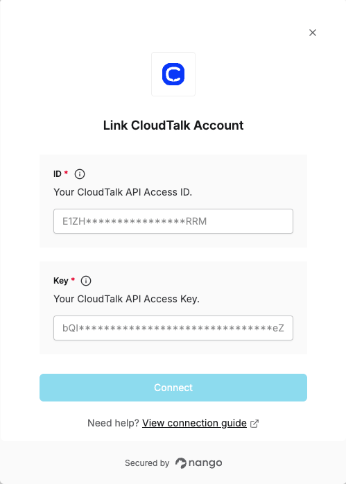 To authenticate with CloudTalk, you will need:- ID – Your CloudTalk API Access Key ID; used as the Basic Auth username.