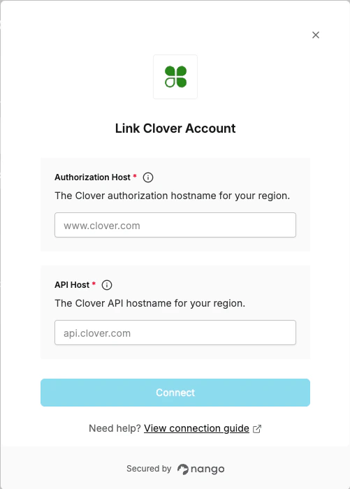 To authenticate with Clover, you need:- Authorization Host - The Clover authorization hostname for your region.
