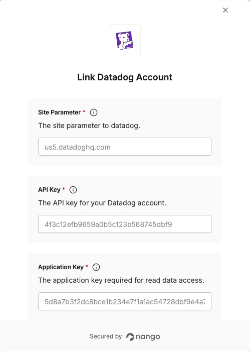 To authenticate with Datadog, you need three key pieces of information:- API Key - Your Datadog API Key