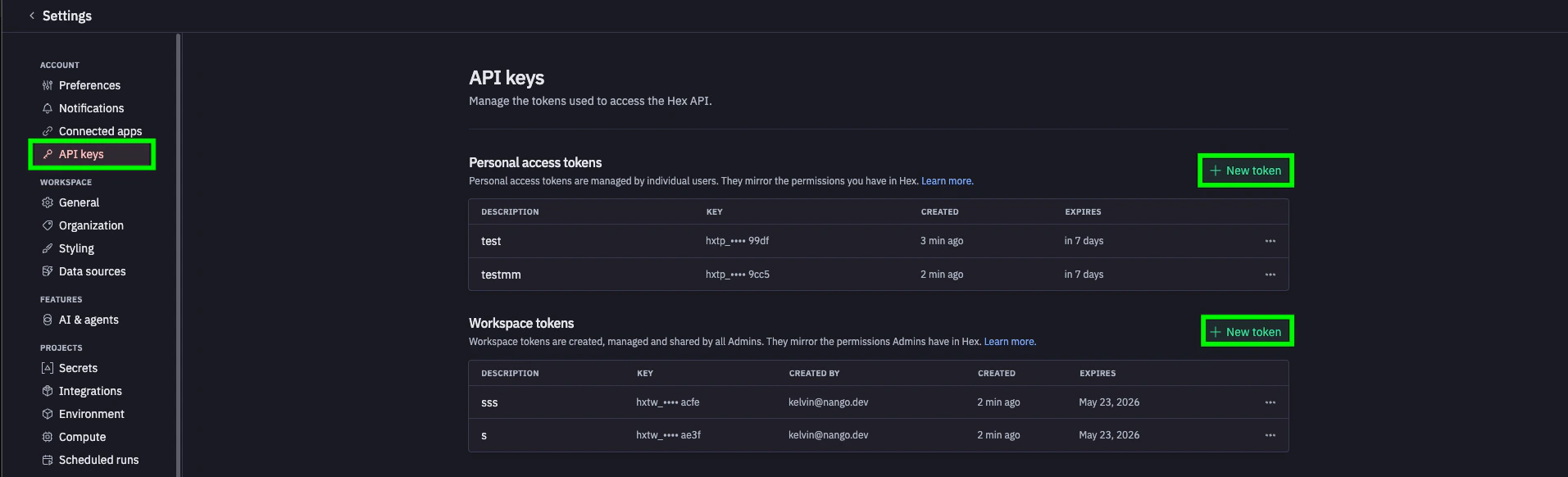 hxtp_) inherit your own permissions and require an expiration date. - Workspace tokens (prefix