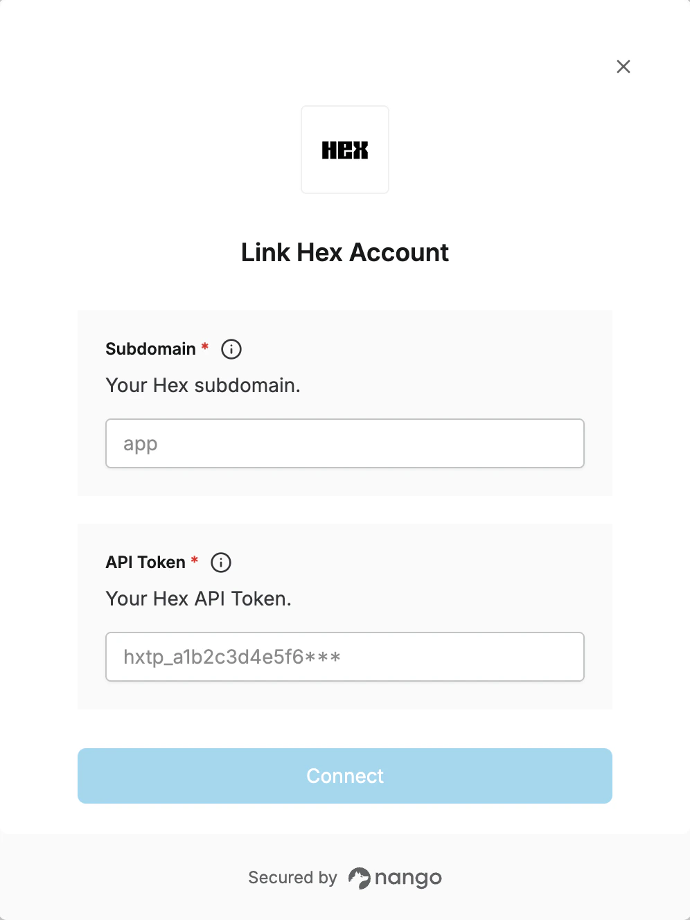 - API Token – A personal access token or workspace token that grants Nango permission to interact with the Hex API on your behalf.