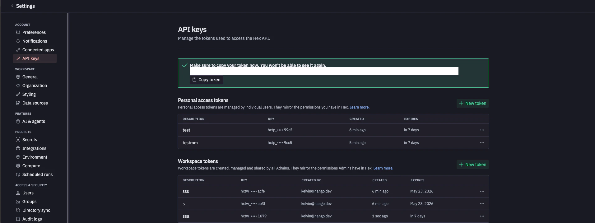 - Copy the token immediately — it is shown once upon creation and cannot be retrieved later.