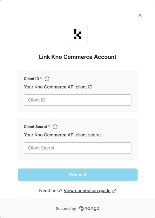 To authenticate with Kno Commerce, you need:- Client ID - The client ID from your Kno Commerce API Access settings.