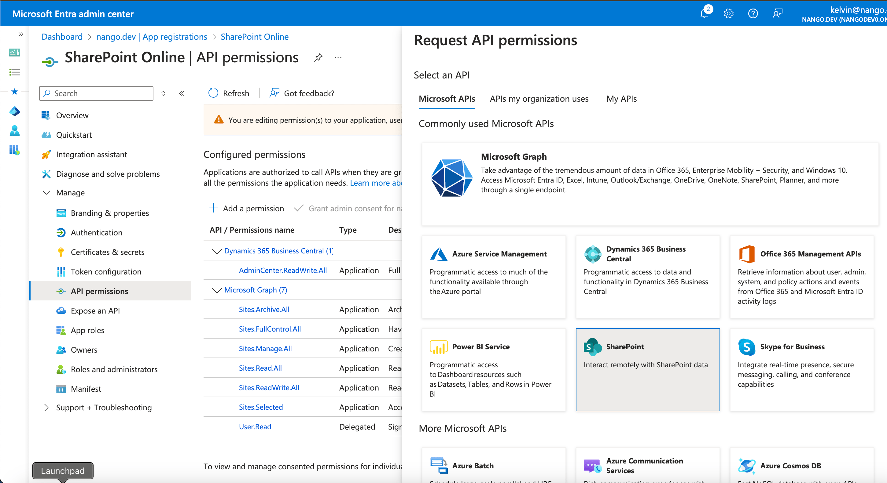 - From the displayed list, choose Application permissions, select the required permissions, and click Add permissions.