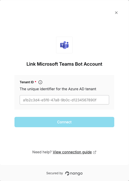To connect Microsoft Teams Bot in Nango, you need to provide:- Tenant ID — The Azure AD tenant with an active MS Teams subscription.