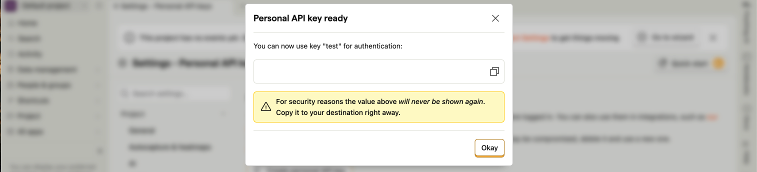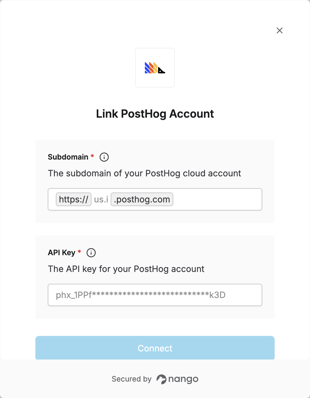https://and before.posthog.com - API Key - A key that grants Nango permission to interact with PostHog’s APIs and services