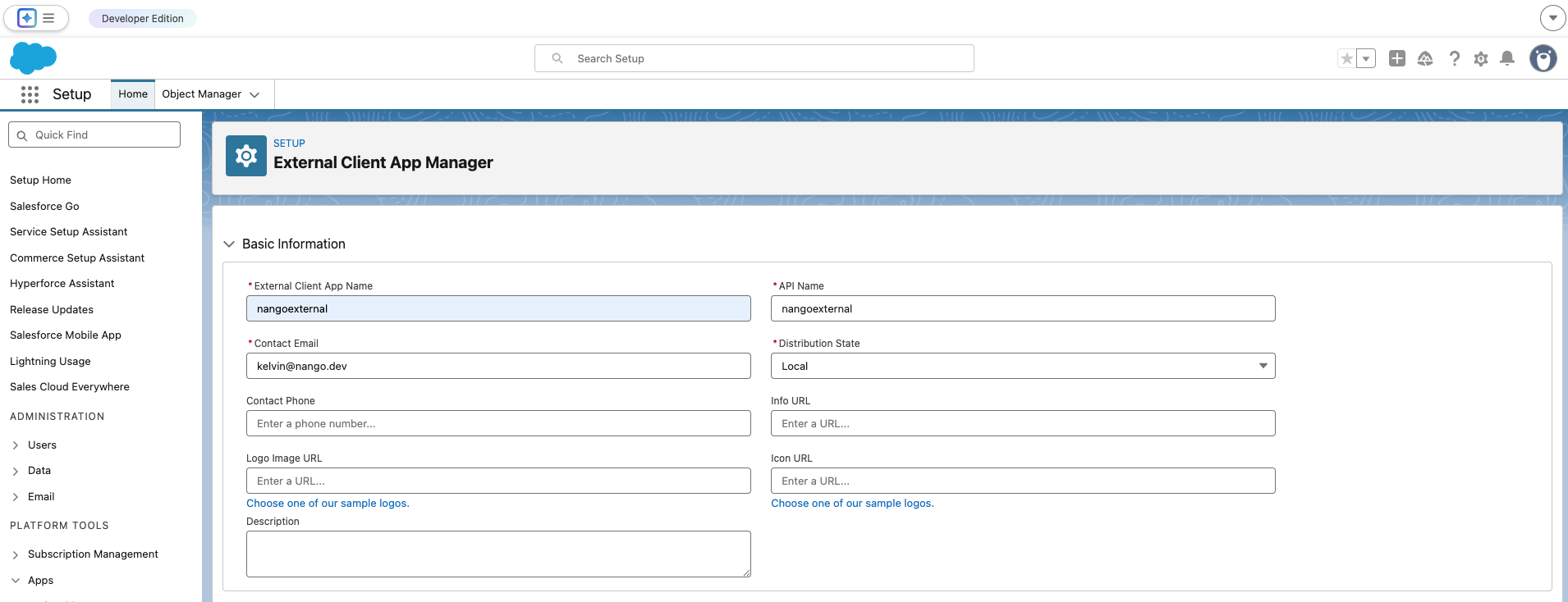- Go to Setup → Apps → App Manager, then click New External Client App.