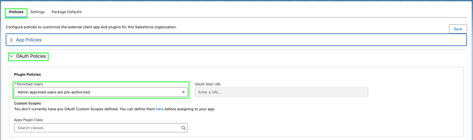 - In your app, go to the Policies tab and click Edit. Under OAuth Policies, select Admin approved users are pre-authorized, then click OK, then Save.