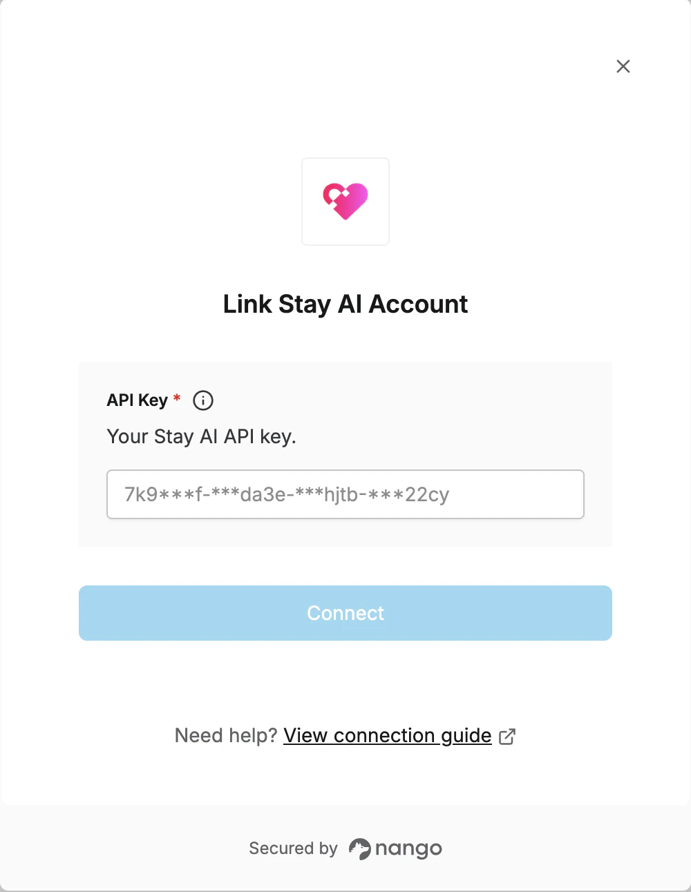 To authenticate with Stay AI, you will need:- API Key - Your Stay AI API key for authentication.