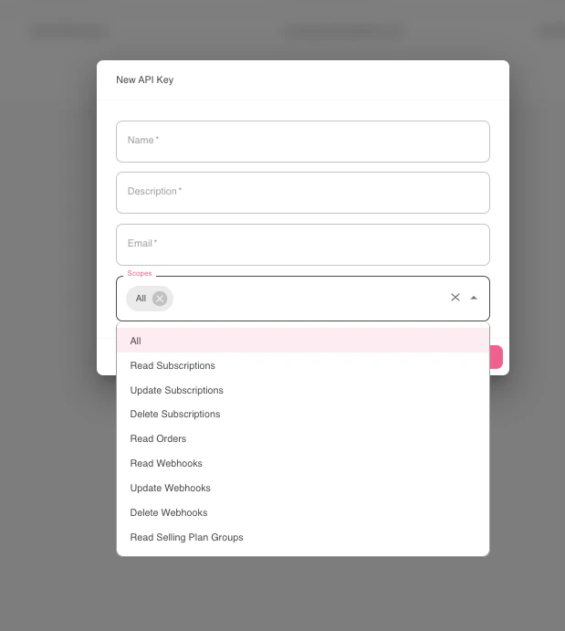 - Fill in the required fields: Name, Description, Email, and pick your desired Scopes.