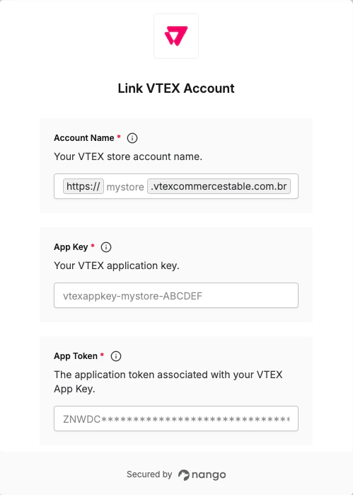 Once you have your Account Name, App Key, and App Token:- Open the Nango connection form for VTEX.