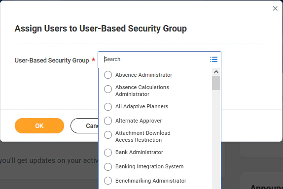 - Click in the User-Based Security Group field and select the appropriate security group for Adaptive Planning.