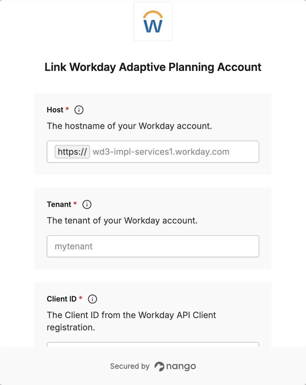To authenticate with Workday Adaptive Planning, you need:- Host - The hostname of your Workday instance (used for API calls and token requests).