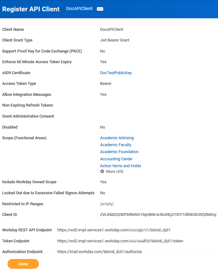 PublicAPIISU_). - Private Key - The RSA private key (PKCS8 PEM format) used to sign the JWT — generated alongside the certificate registered in your Workday API client.