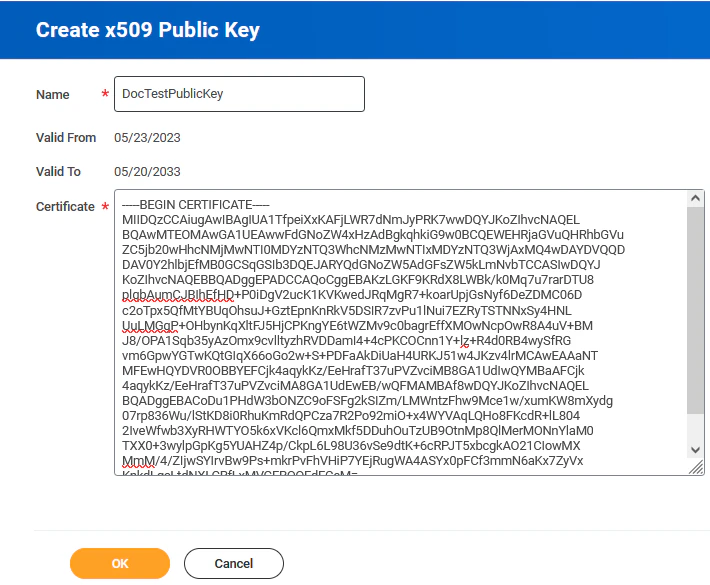 cert_workday.pem(including the-----BEGIN CERTIFICATE-----and-----END CERTIFICATE-----lines) and paste it into the Certificate field. - Click OK.