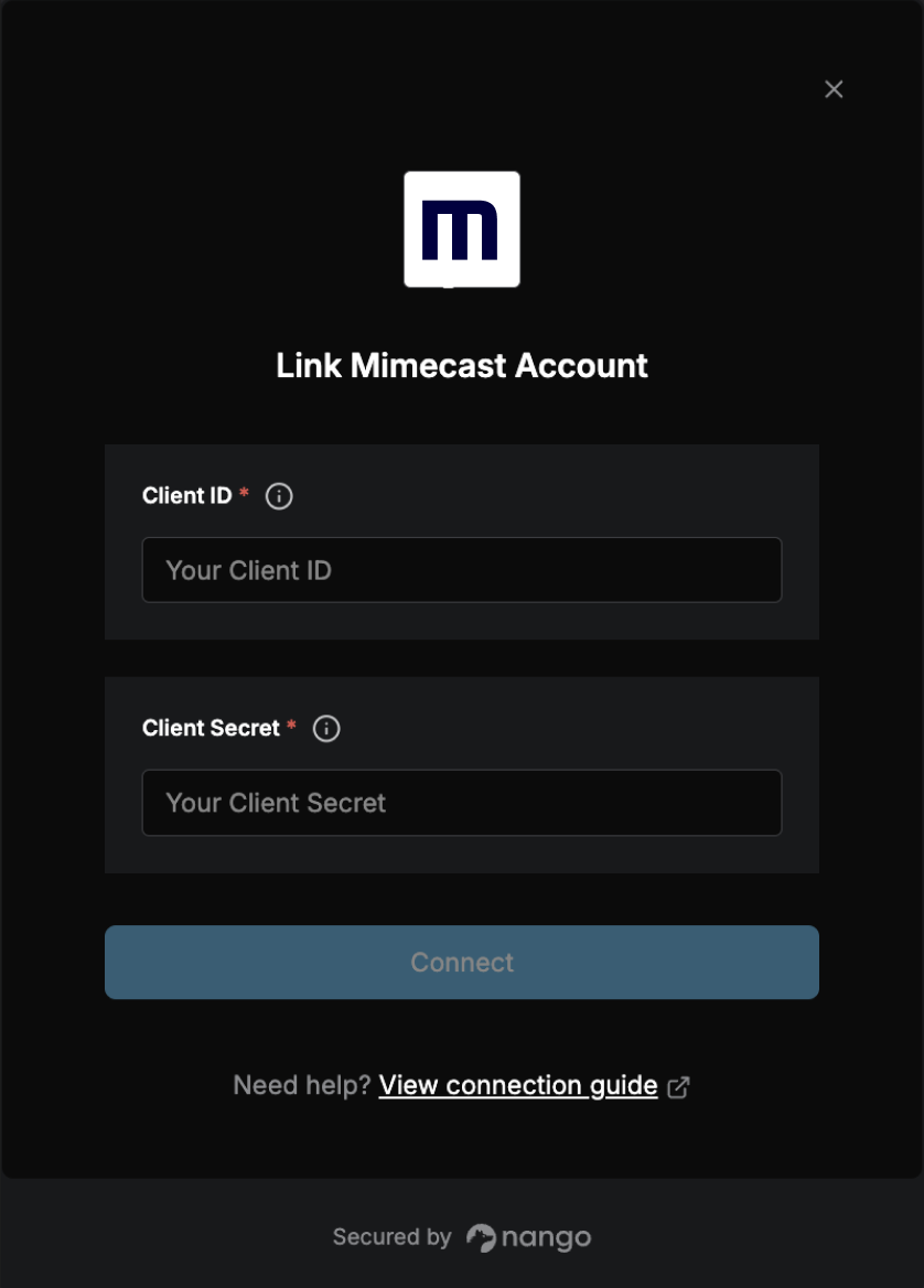 To authenticate with Mimecast, you need:- Client ID – Your Mimecast API 2.0 application’s Client ID