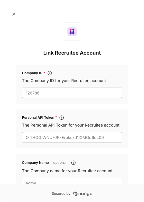 1. Personal API Token - A personal API token that grants Nango permission to interact with Recruitee’s ATS API.