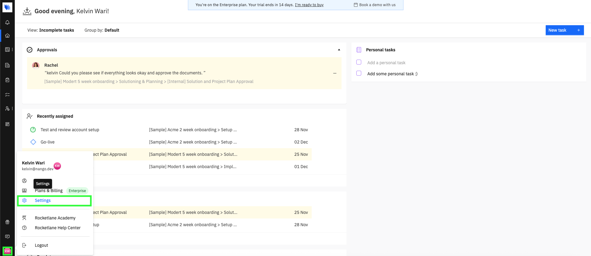 - Log in to your Rocketlane account, click on your profile, then click Settings.