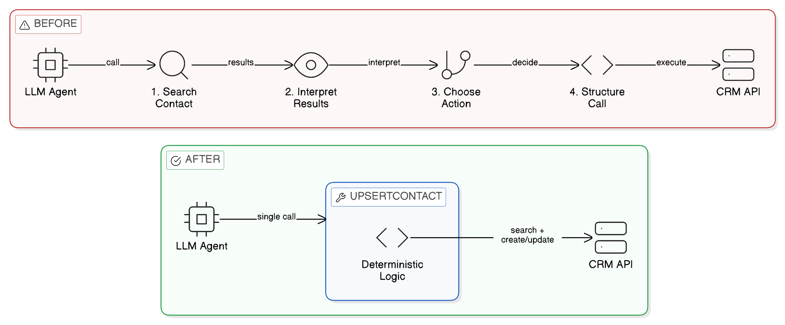 Instead, expose tools designed around actual user outcomes, such as upsertContact. Handle the deterministic logic entirely within the tool's code.