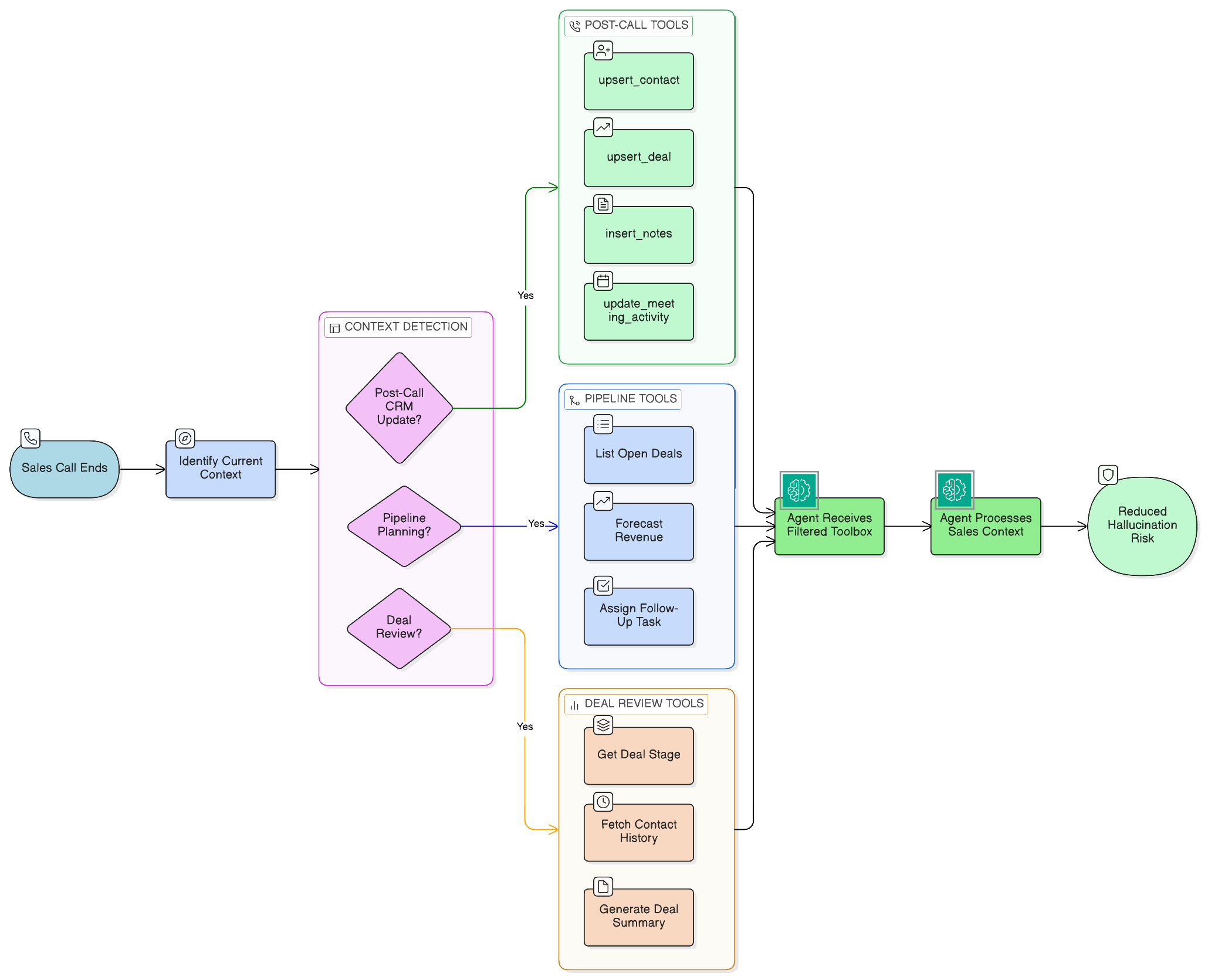 By narrowing the toolbox to the current domain, you eliminate the risk that the agent will accidentally trigger an unrelated high-stakes action.