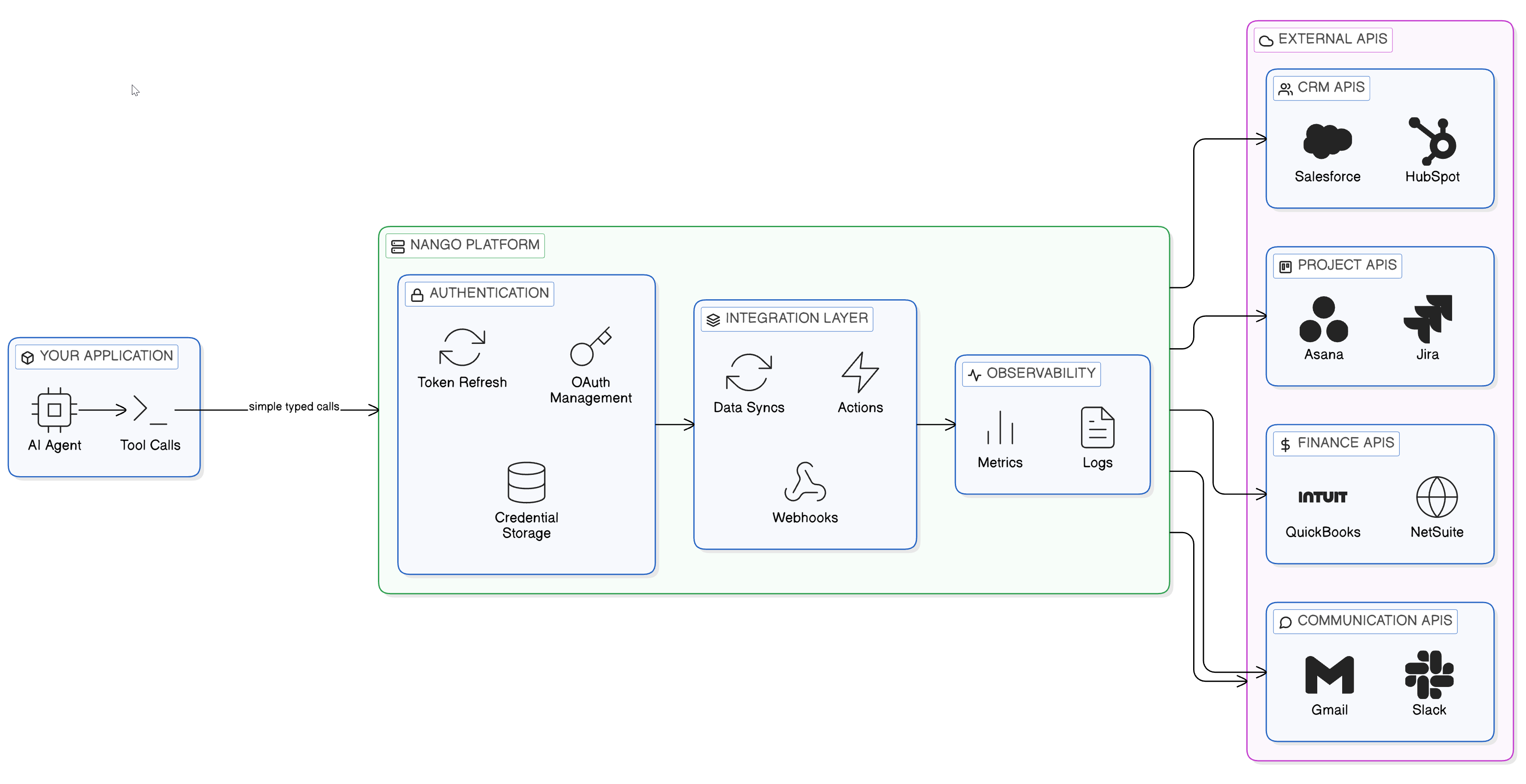 - Webhook handling: Reliable agents often need to react to external events. Nango can handle webhooks from external APIs and trigger Actions or Data syncs.