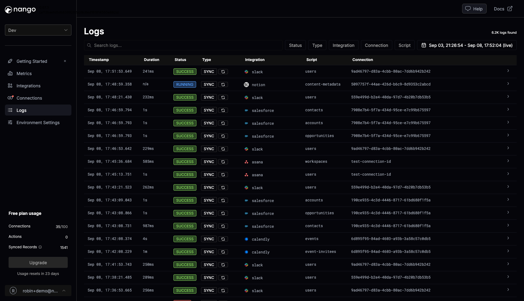 - Observability: Nango provides per-integration request logs, error rates, and latency, supporting OpenTelemetry export.