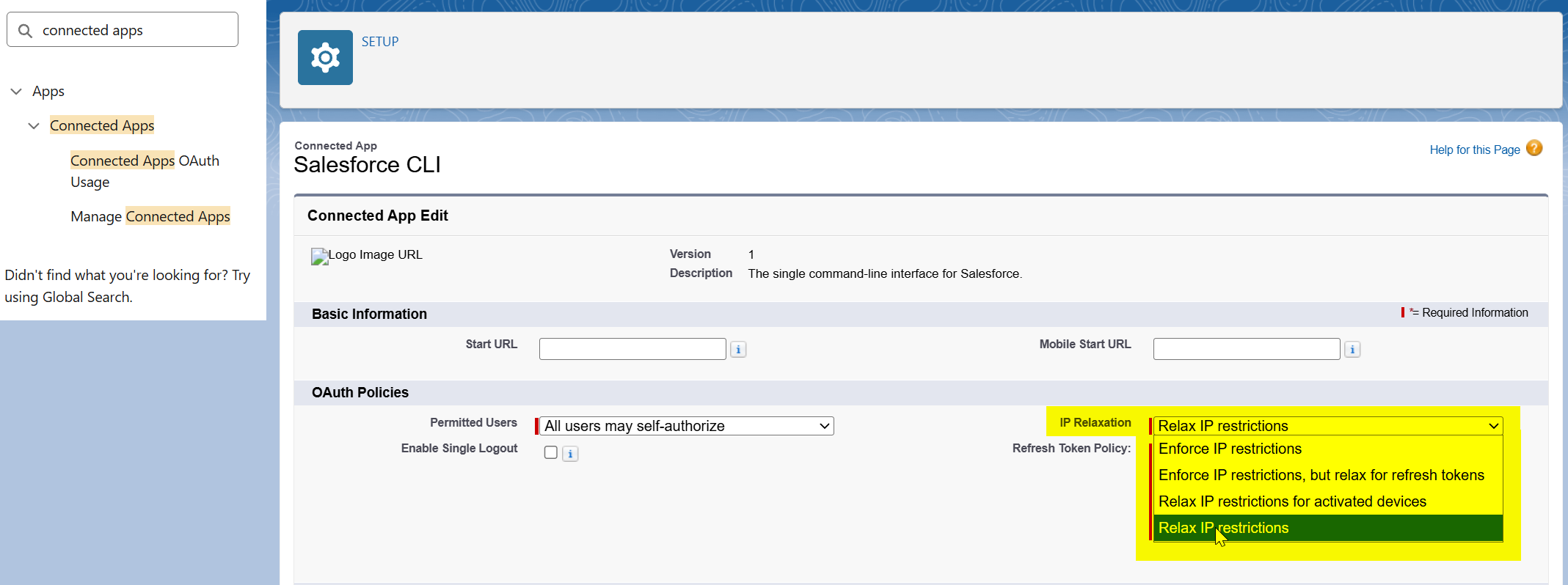- Alternatively, an Admin can relax IP restrictions on the Connected App's policies by going to "Setup > Connected Apps > APP > Edit Policies" and setting "IP Relaxation" to Relax IP restrictions.