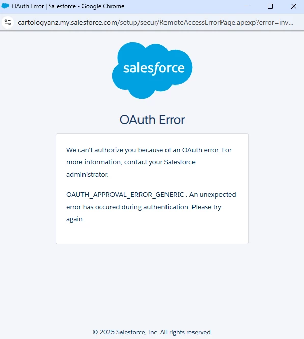 When a user attempts to install or authorize a Connected App, the Salesforce instance's security restrictions evaluate the request. If the policies prohibit the installation, Salesforce halts the flow before the approval dialog even renders. Because the UI is entirely blocked, Salesforce throws a generic error rather than a specific access denial. (Generic OAuth errors are a common pain point across APIs.)